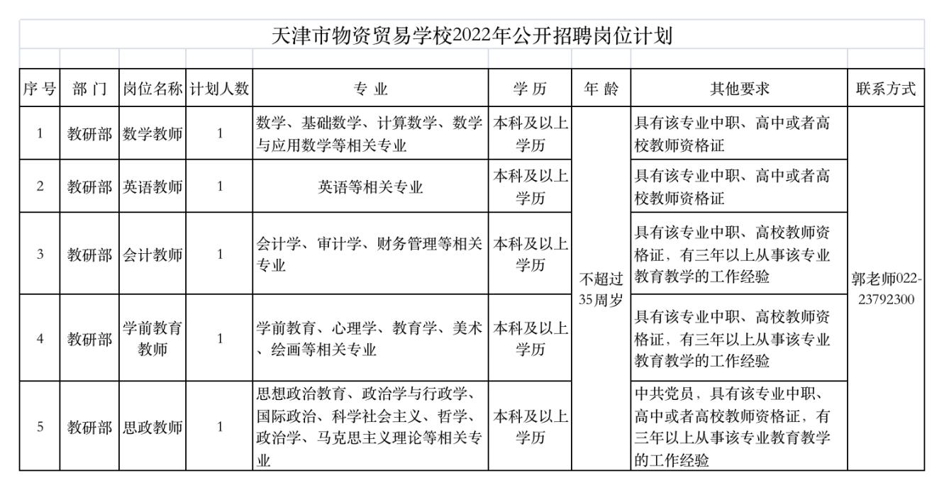 具體招聘崗位見(jiàn)《天津市物資貿(mào)易學(xué)校2022年公開(kāi)招聘崗位計(jì)劃》。