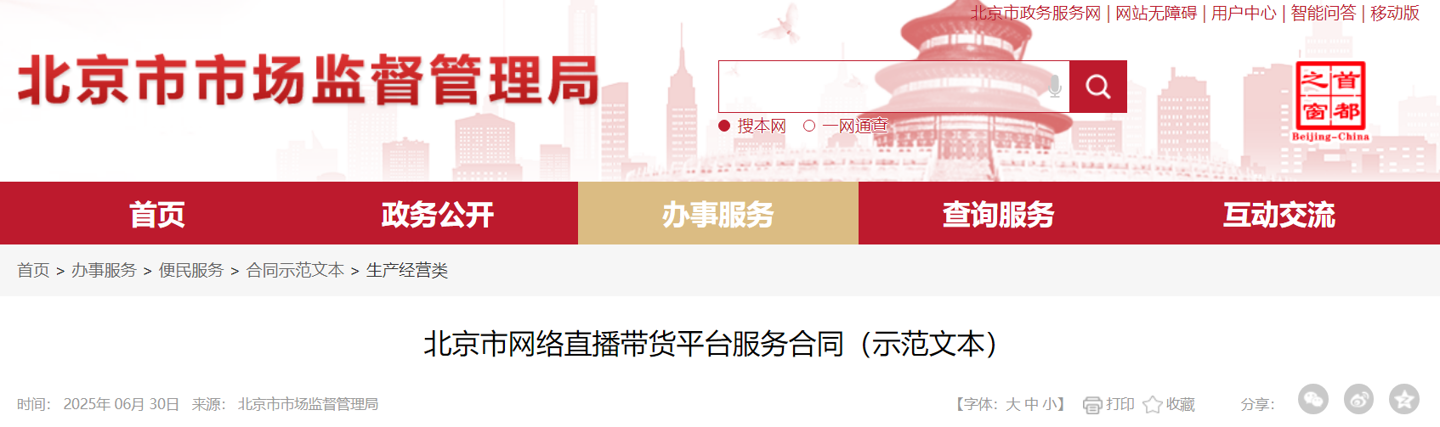 據(jù)北京市市場監(jiān)督管理局7月8日消息,北京市市場監(jiān)督管理局正式發(fā)布《北京市網(wǎng)絡直播帶貨平臺服務合同(示范文本)(試行)》。該文本系全國首個 ...