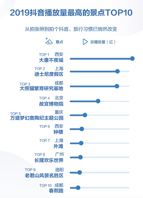在抖音,一個人帶火一座城已成獨特現(xiàn)象。23歲的抖音用戶@皮卡晨化身“不倒翁小姐姐”,掀起握手狂潮,吸引人們爭相實地打卡。報告顯示,#大唐不夜城不倒翁#相關(guān)視頻播放量超23億次,西安大唐不夜城景點位列2019抖音播放量最高的景點首位,其次為上海迪士尼度假區(qū)和成都大熊貓繁育研究基地。