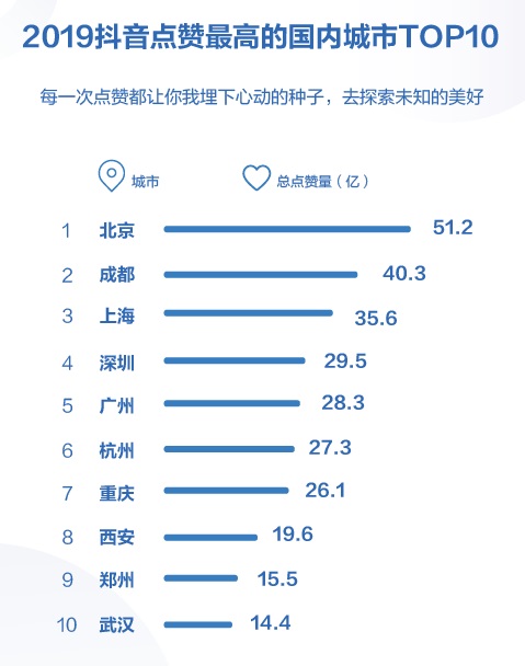 2020-01-07 12:59:00閱讀()抖音2019年,抖音上點贊最多的城市是哪個?最火的景點在哪里?最流行的音樂、貼紙是什么?不同年齡段用戶喜歡拍攝的內(nèi)容有何變化?1月6日,抖音發(fā)布《2019抖音數(shù)據(jù)報告》(以下簡稱“報告”),對以上問題進(jìn)行了解讀。