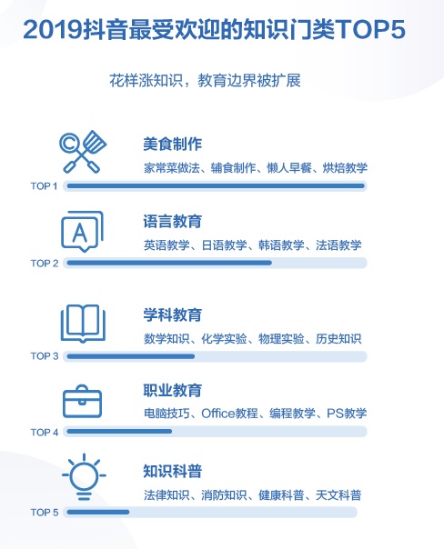 報告顯示,知識類視頻正成為抖音內(nèi)容生態(tài)的重要組成部分。2019年,抖音萬粉知識創(chuàng)作者發(fā)布1489萬個視頻,1.3億用戶聽過@向波老師的化學(xué)課。最受歡迎的知識門類是美食制作,人們在抖音學(xué)習(xí)家常菜、輔食、懶人早餐和烘焙等烹飪技巧,其次為語言教育、學(xué)科教育、職業(yè)教育和知識科普,滿足各類人群的學(xué)習(xí)需求。