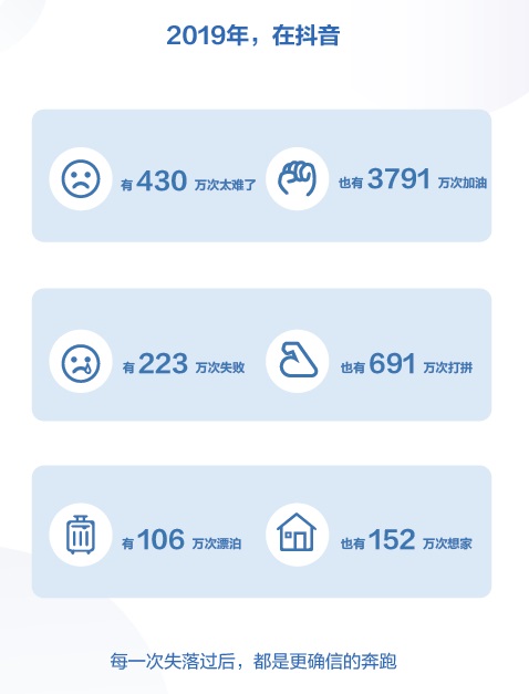 報告顯示,2019年有46萬個家庭在抖音拍下全家福視頻,記錄一家人相親相愛的幸福時刻,相關(guān)視頻被點贊1億次。同時,人們也在抖音記錄下淚水與歡笑,全年抖音上有430萬次“太難了”,也有3791萬次加油;有223萬次失敗,但也有691萬次打拼。