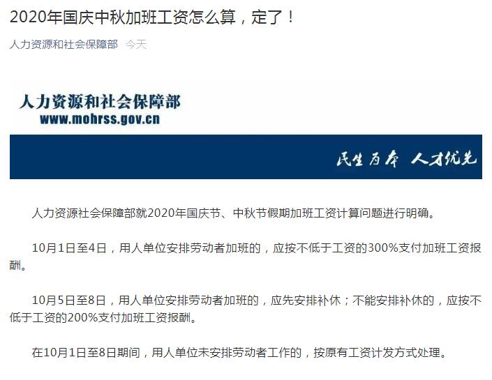 人社部明確國慶中秋加班工資:10月1日至4日加班發(fā)3倍工資