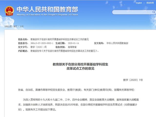 2020-01-16 12:58:00閱讀()教育部教育部官網(wǎng)發(fā)布《教育部部署在部分高校開(kāi)展基礎(chǔ)學(xué)科招生改革試點(diǎn)工作》的消息(點(diǎn)擊查看相關(guān)文件:《教育部關(guān)于在部分高校開(kāi)展基礎(chǔ)學(xué)科招生改革試點(diǎn)工作的意見(jiàn)》)。