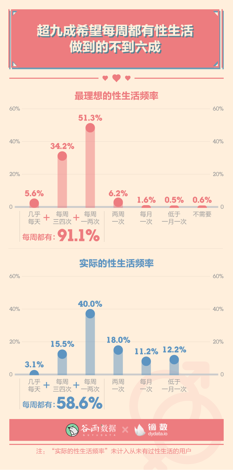 有91.1%的人最理想的性生活頻率都高于一周一次,但只有58.6%的人能夠?qū)崿F(xiàn)。還有12.2%的人性生活頻率低于一月一次。