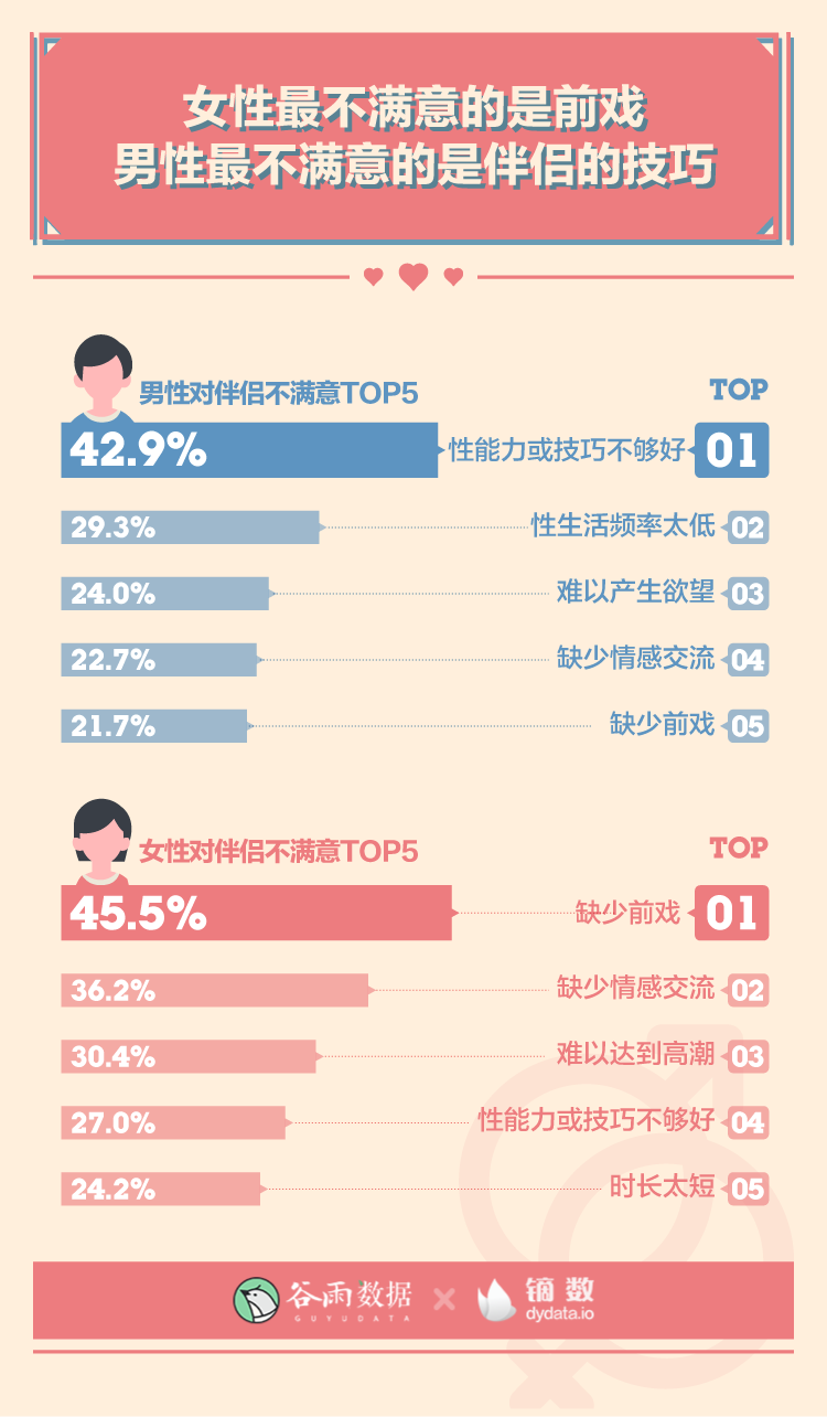 在對伴侶不滿意的各項原因里,讓女性最不滿意的是“缺少前戲”,讓男性最不滿意的是“性能力或技巧不夠好”。
