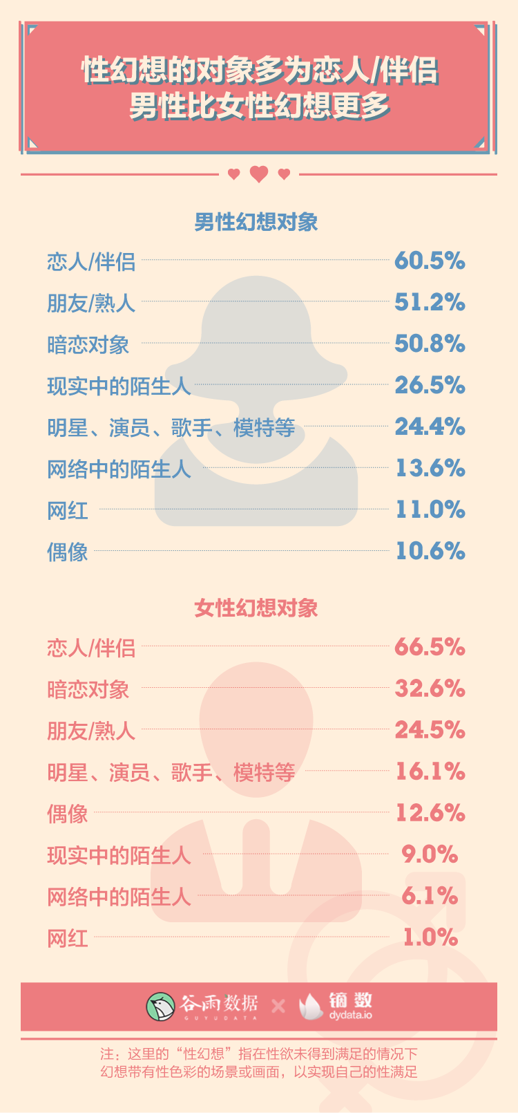 雖然不分男女,排名前三的性幻想對象都是:戀人/伴侶、暗戀對象、朋友/熟人,但男性的性幻想對象明顯更加多元,女性則相對集中。