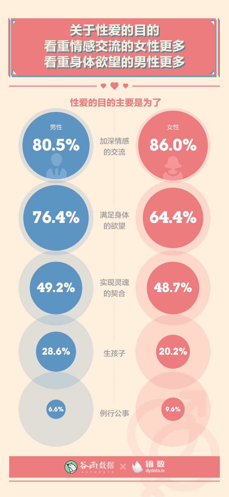 關(guān)于性愛的目的,男性傾向于“滿足身體的欲望”的比例比女性高出12%,傾向于“生孩子”的比例比女性高出8.4%。“加深情感的交流”則是二者都最為重視的。