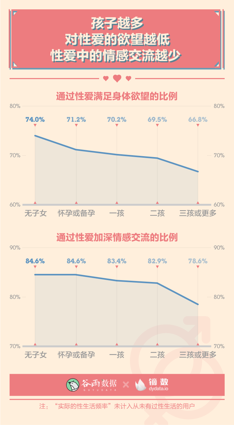 調(diào)查還顯示,孩子越多,對性愛的欲望就越低,性愛中的情感交流就越少。 每一個孩子的出生,可能都在讓無性婚姻越來越近。
