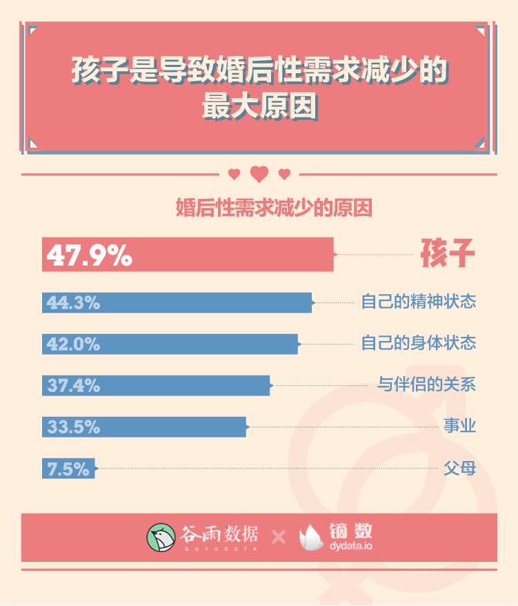 我們的調(diào)查顯示,在所有導(dǎo)致婚后性需求減少的原因中,“孩子”超越了“精神狀態(tài)”、“身體狀態(tài)”、“伴侶關(guān)系”等,成為性生活的“頭號殺手”。