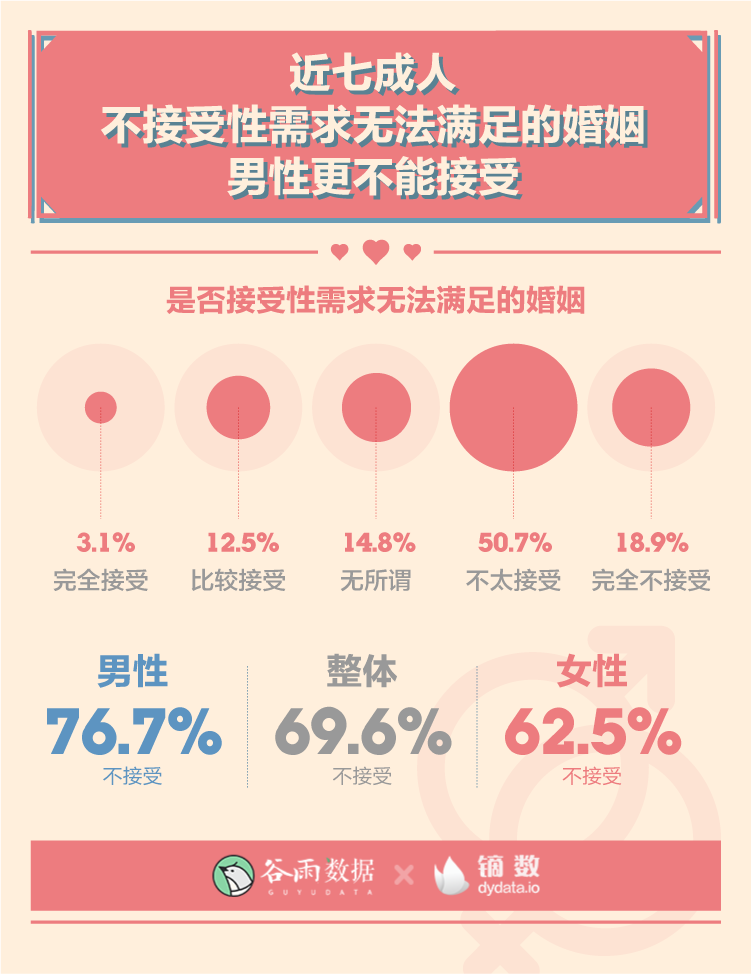 性在婚姻中是否是必不可少的?對于大多數(shù)人來說,性需求無法滿足都會成為婚姻的致命傷。76.7%的男性和62.5%的女性不接受性需求無法滿足的婚姻。