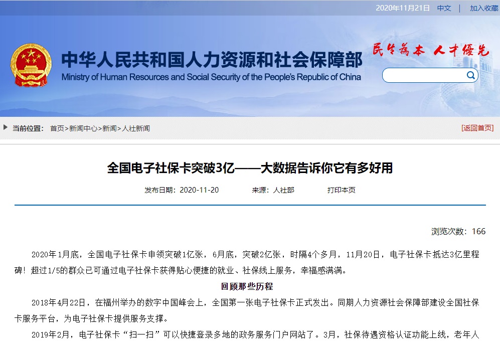 2020-11-21 17:28:10閱讀()人社部11月21日消息 根據(jù)人社部的消息,截至 11 月 20 日,電子社保卡抵達(dá) 3 億里程碑,超過(guò) 1/5 的群眾已可通過(guò)電子社??ǐ@得貼心便捷的就業(yè)、社保線上服務(wù)。