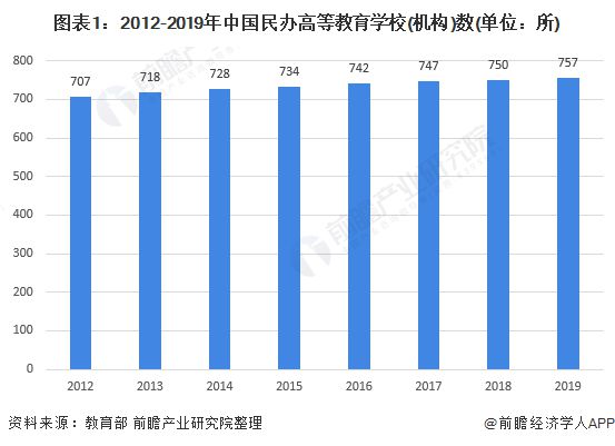 根據(jù)前瞻產(chǎn)業(yè)研究院分析,從民辦高等教育學(xué)校數(shù)量規(guī)模來看,2012-2019年,全國民辦高等教育學(xué)校逐年增加,2019年,我國民辦高等學(xué)校757所(含獨(dú)立學(xué)院257所,成人高校1所),比上年增加7所。