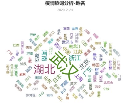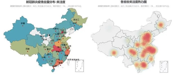 我們對熱搜中出現(xiàn)的所有地名進行了統(tǒng)計,得出了地名的詞云,并畫出了各省份關(guān)注度的分布和熱力圖??梢钥吹?,武漢和湖北是關(guān)注最多的地方,而河南、山東、浙江、廣東等地區(qū)的出鏡率也很高。