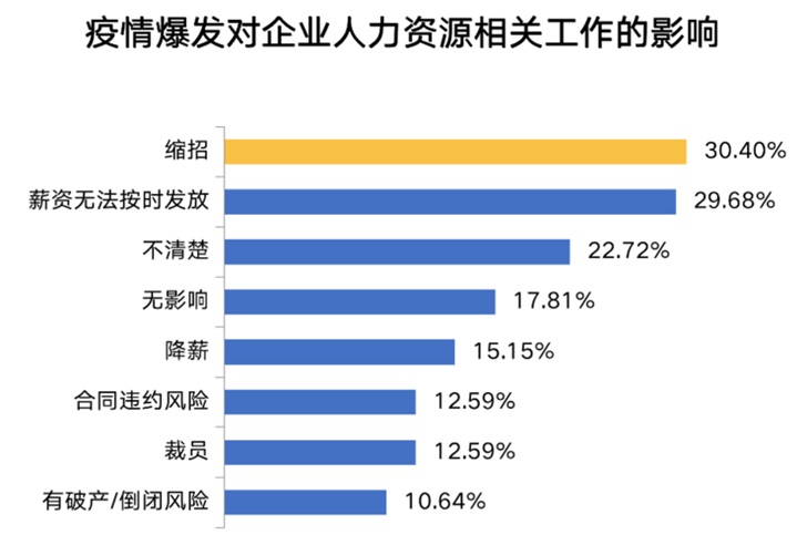 根據(jù)智聯(lián)招聘的調(diào)查,30.4% 的企業(yè)表示將會減員縮編,還有 29.68% 無法為員工按時發(fā)放薪資,無影響的企業(yè)僅占 17.81% 。另外,慘淡經(jīng)營下,降薪、合同違約風(fēng)險、裁員也成為企業(yè)不得不面對的問題,10.64% 的受訪企業(yè)面臨著破產(chǎn)或倒閉的風(fēng)險。