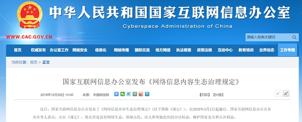 2020-03-02 15:32:29閱讀()國家互聯(lián)網信息辦公室由國家互聯(lián)網信息辦公室發(fā)布的《網絡信息內容生態(tài)治理規(guī)定》(以下簡稱《規(guī)定》)已于昨日(3月1日)起施行,旨在營造良好網絡生態(tài),保障公民、法人和其他組織的合法權益,維護國家安全和公共利益。