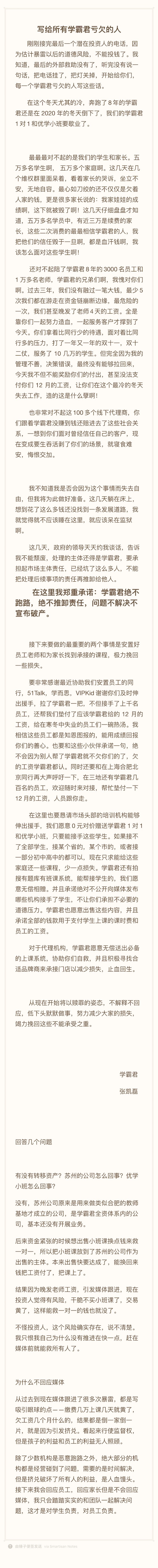 不過,張凱磊在信中承諾:“學霸君絕不跑路,絕不推卸責任,問題不解決不宣布破產。”