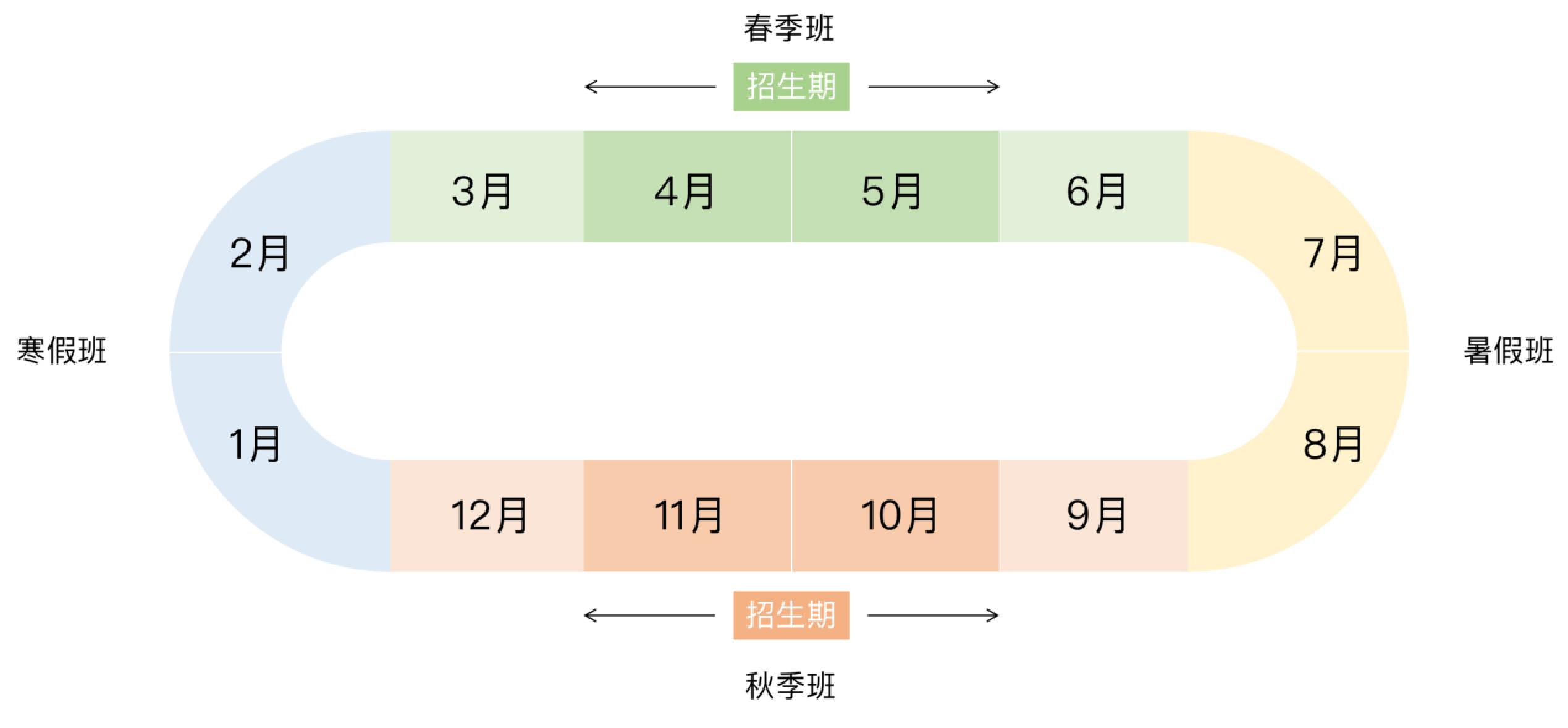 目前國內(nèi)的k12教育課外培訓(xùn)以補充課內(nèi)和提升為主,所以在課程時間安排、課程內(nèi)容的設(shè)置都與公立校有緊密的聯(lián)系。在春/秋季班只能都得在課余時間參加培訓(xùn),所以3-6月和9-12月的課程基本在工作日的晚上和周末開展。而暑/寒假班是校內(nèi)放假階段,所以7-8月和1-2月則可以全天參與培訓(xùn)。