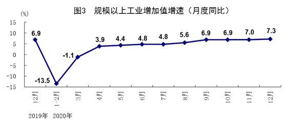 全年全國(guó)規(guī)模以上工業(yè)增加值比上年增長(zhǎng)2.8%。分經(jīng)濟(jì)類型看,國(guó)有控股企業(yè)增加值增長(zhǎng)2.2%;股份制企業(yè)增長(zhǎng)3.0%,外商及港澳臺(tái)商投資企業(yè)增長(zhǎng)2.4%;私營(yíng)企業(yè)增長(zhǎng)3.7%。分三大門(mén)類看,采礦業(yè)增加值增長(zhǎng)0.5%,制造業(yè)增長(zhǎng)3.4%,電力、熱力、燃?xì)饧八a(chǎn)和供應(yīng)業(yè)增長(zhǎng)2.0%。高技術(shù)制造業(yè)和裝備制造業(yè)增加值分別比上年增長(zhǎng)7.1%、6.6%,增速分別比規(guī)模以上工業(yè)快4.3、3.8個(gè)百分點(diǎn)。從產(chǎn)品產(chǎn)量看,工業(yè)機(jī)器人、新能源汽車、集成電路、微型計(jì)算機(jī)設(shè)備同比分別增長(zhǎng)19.1%、17.3%、16.2%、12.7%。四季度,規(guī)模以上工業(yè)增加值同比增長(zhǎng)7.1%,比三季度加快1.3個(gè)百分點(diǎn)。12月份,規(guī)模以上工業(yè)增加值同比增長(zhǎng)7.3%,比上月加快0.3個(gè)百分點(diǎn),環(huán)比增長(zhǎng)1.10%。2020年,全國(guó)工業(yè)產(chǎn)能利用率為74.5%。四季度,全國(guó)工業(yè)產(chǎn)能利用率為78.0%,比三季度上升1.3個(gè)百分點(diǎn)。