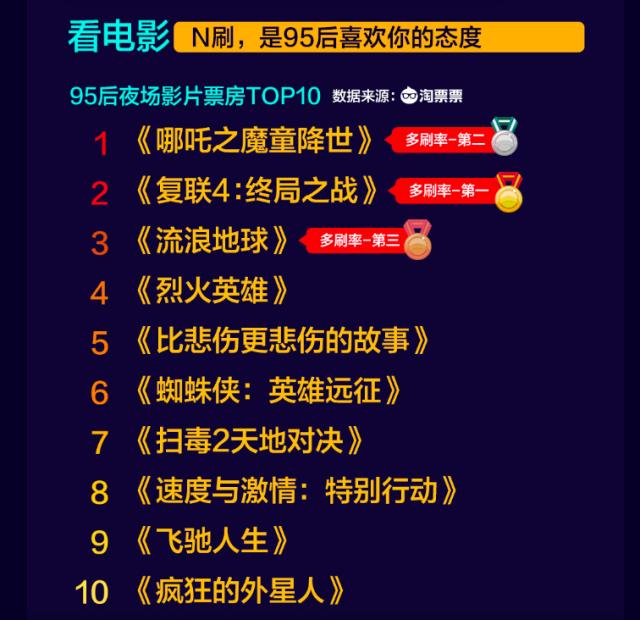 數(shù)據(jù)指出,超過35%的夜場電影用戶為95后。95后年輕人對電影的偏好與票房分布基本一致,直接影響票房大盤走勢。對于自己喜歡的優(yōu)質(zhì)電影,95后夜貓子傾向于用“多刷”的方式表達(dá)支持。淘票票數(shù)據(jù)顯示,2019年1月以來,95后“N刷”最多的影片依次是《復(fù)仇者聯(lián)盟4:終局之戰(zhàn)》《哪吒之魔童降世》《流浪地球》。