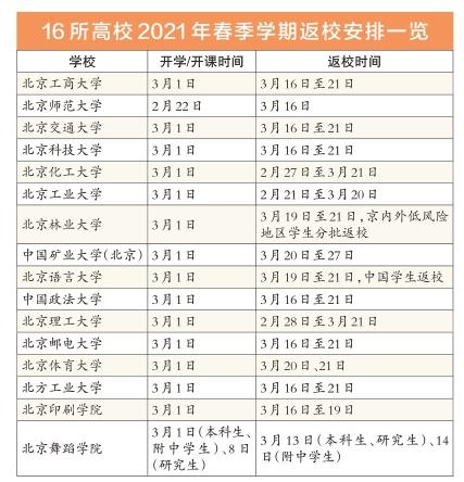 2021-02-18 11:03:33閱讀()北京日報(bào)對于在京高校大學(xué)生而言,即將到來的2021年春季學(xué)期,“如期開學(xué)、延遲返校”將成為潮流。記者近日從官方渠道了解到,北京師范大學(xué)、北京交通大學(xué)、北京科技大學(xué)、北京化工大學(xué)等16所在京高校均發(fā)布最新通知,新學(xué)期在原計(jì)劃的開學(xué)之日以線上教學(xué)方式開課,時間大多集中于3月1日;學(xué)生返校日期則延后至3月中下旬。