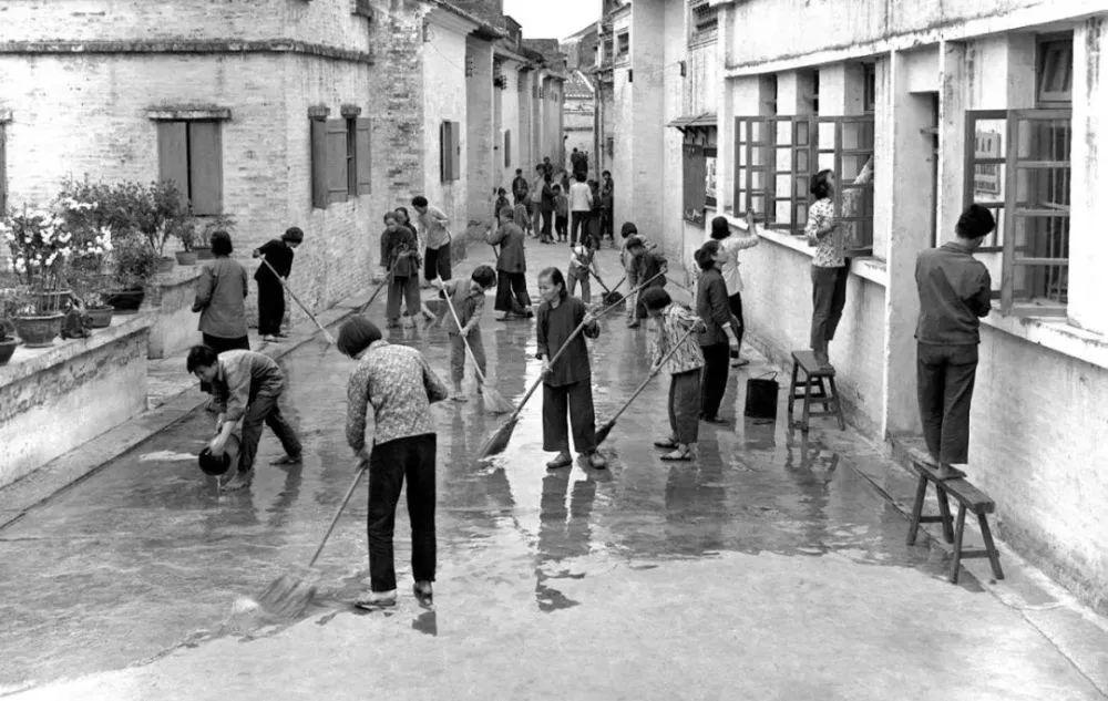 1966年1月17日,全國(guó)衛(wèi)生紅旗單位廣東省佛山市在春節(jié)前夕,又掀起一個(gè)愛國(guó)衛(wèi)生運(yùn)動(dòng)的高潮。圖為佛山市滘邊街居民在洗刷街道。新華社記者 李開遠(yuǎn) 攝