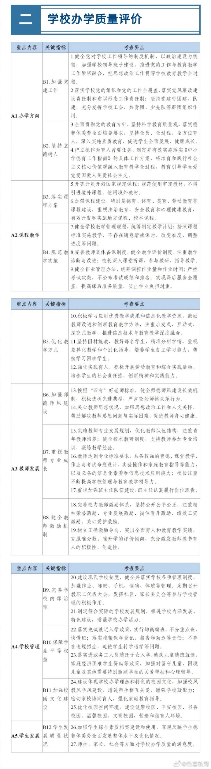 學(xué)校辦學(xué)質(zhì)量評(píng)價(jià)主要包括辦學(xué)方向、課程教學(xué)、教師發(fā)展、學(xué)校管理、學(xué)生發(fā)展等五方面內(nèi)容,旨在促進(jìn)學(xué)校落實(shí)德智體美勞全面培養(yǎng)要求,深入實(shí)施素質(zhì)教育,充分激發(fā)辦學(xué)活力,不斷提高辦學(xué)水平和育人質(zhì)量。