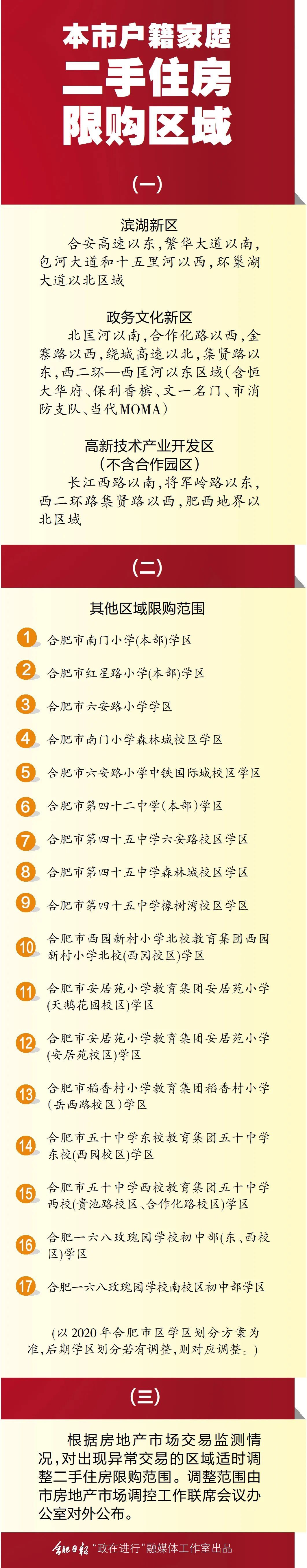 為精準(zhǔn)打擊部分區(qū)域二手住房和學(xué)區(qū)房炒作行為,在嚴(yán)格執(zhí)行《關(guān)于進(jìn)一步促進(jìn)我市房地產(chǎn)市場(chǎng)平穩(wěn)健康發(fā)展的若干意見(jiàn)的通知》(合政辦〔2016〕43號(hào))的基礎(chǔ)上,進(jìn)一步收緊我市部分區(qū)域二手住房限購(gòu)政策,即暫停市區(qū)范圍內(nèi)擁有2套及以上住房的本市戶(hù)籍居民家庭在濱湖新區(qū)、政務(wù)文化新區(qū)、高新技術(shù)產(chǎn)業(yè)開(kāi)發(fā)區(qū)和其他區(qū)域指定學(xué)校的學(xué)區(qū)范圍內(nèi)購(gòu)買(mǎi)二手住房。其中,學(xué)區(qū)范圍以2020年教育主管部門(mén)學(xué)區(qū)劃分方案為準(zhǔn),后期學(xué)區(qū)劃分若有調(diào)整,則限購(gòu)范圍對(duì)應(yīng)調(diào)整。
