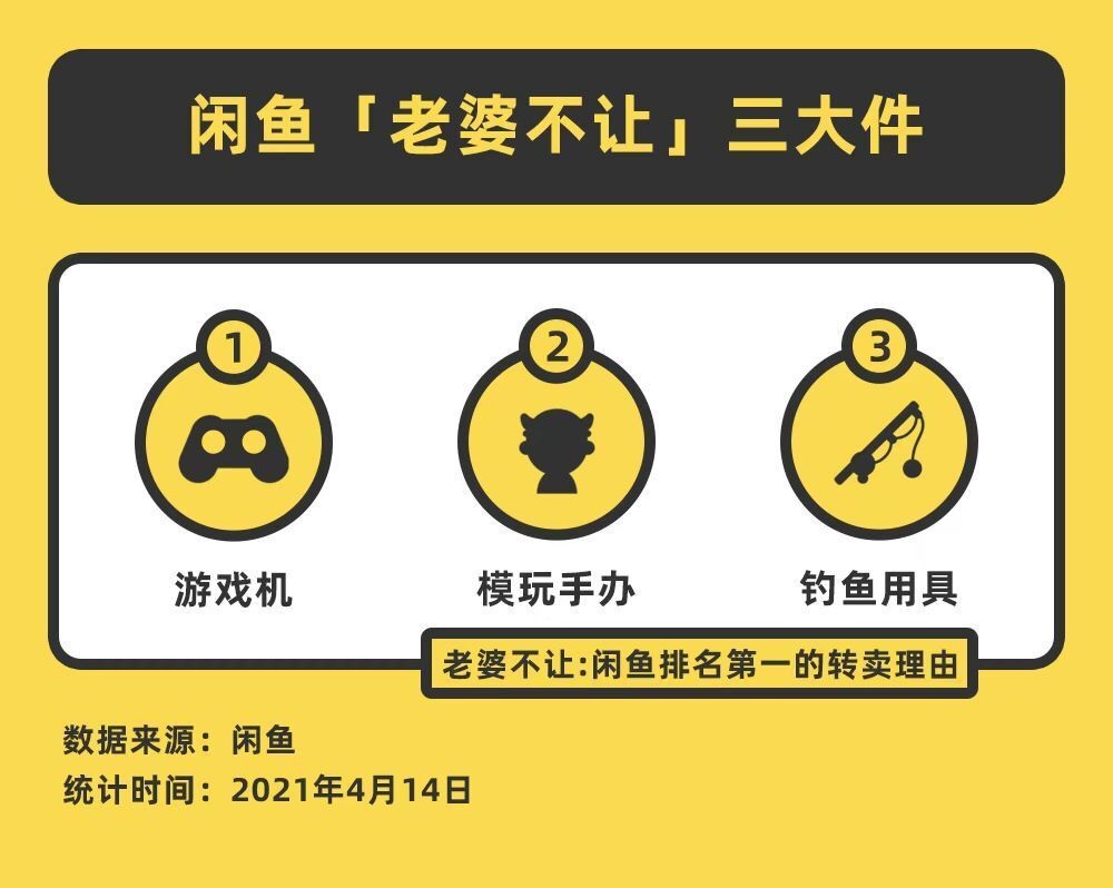 2021-04-14 16:39:58閱讀()閑魚4月14日消息4月14日,閑魚公布十大轉賣理由。從2018年到現(xiàn)在,“老婆不讓”始終高居榜首。比如“老婆不讓釣魚,再釣老婆就帶著孩子回娘家,魚竿半價處理”“昨天剛買的Switch國行版游戲機,老婆不讓玩,原價出”……