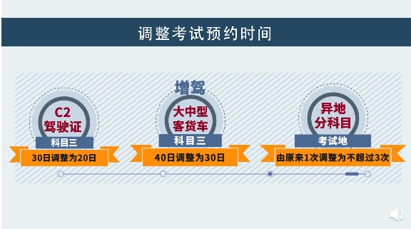 ②自動(dòng)擋科目三約考間隔時(shí)間,由科目一考試合格后30日調(diào)整為20日;