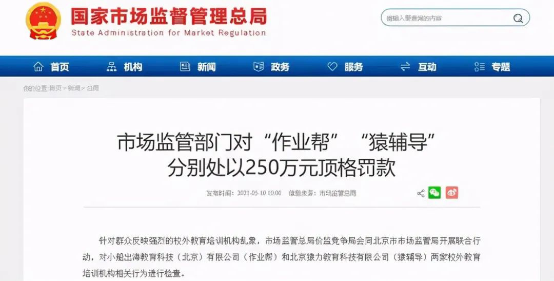 5月10日,國(guó)家市場(chǎng)監(jiān)督管理總局發(fā)布通告,稱(chēng)作業(yè)幫及猿輔導(dǎo)存在虛假宣傳及誘騙消費(fèi)者交易等行為,被北京市市場(chǎng)監(jiān)管局處以警告和250萬(wàn)元罰款的行政處罰。