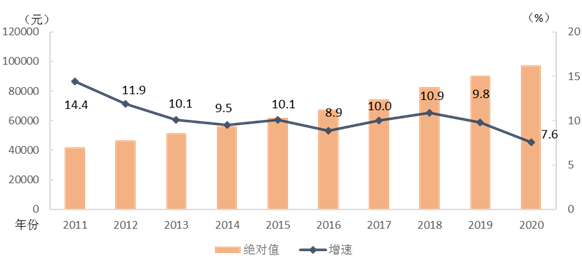 2011-2020年城鎮(zhèn)非私營(yíng)單位就業(yè)人員年平均工資及增速