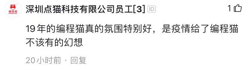 部分編程貓的員工表示,公司的氛圍到了2020年就變了,2019年之前都不錯,”是疫情給了編程貓不該有的幻想“。