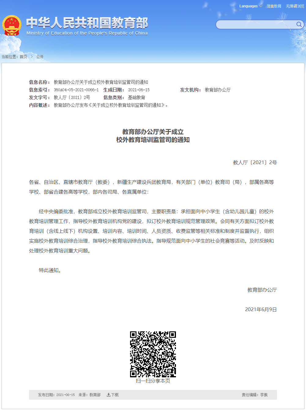 各省、自治區(qū)、直轄市教育廳(教委),新疆生產建設兵團教育局,有關部門(單位)教育司(局),部屬各高等學校、部省合建各高等學校,部內各司局、各直屬單位:經中央編委批準,教育部成立校外教育培訓監(jiān)管司,主要職責是:承擔面向中小學生(含幼兒園兒童)的校外教育培訓管理工作,指導校外教育培訓機構黨的建設,擬訂校外教育培訓規(guī)范管理政策。會同有關方面擬訂校外教育培訓(含線上線下)機構設置、培訓內容、培訓時間、人員資質、收費監(jiān)管等相關標準和制度并監(jiān)督執(zhí)行,組織實施校外教育培訓綜合治理,指導校外教育培訓綜合執(zhí)法。指導規(guī)范面向中小學生的社會競賽等活動。及時反映和處理校外教育培訓重大問題。