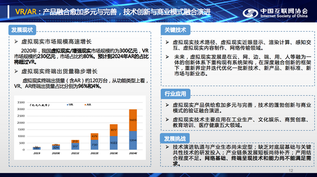 報(bào)告顯示,我國虛擬現(xiàn)實(shí)市場規(guī)模高速增長。2020年,我國虛擬現(xiàn)實(shí)/增強(qiáng)現(xiàn)實(shí)市場規(guī)模約為300億元,VR市場規(guī)模約230億元,市場占比約80%。預(yù)計(jì)到2024年AR的占比將超過VR。虛擬現(xiàn)實(shí)終端出貨量穩(wěn)步增長,虛擬現(xiàn)實(shí)終端出貨量(含AR)約120萬臺,從功能類型上看,VR、AR終端出貨量占比分別為96%和4%。