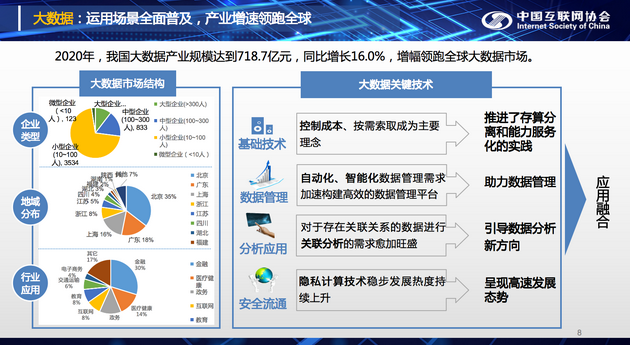 報(bào)告顯示,2020年我國大數(shù)據(jù)產(chǎn)業(yè)規(guī)模達(dá)到718.7億元,同比增長16.0%,增幅領(lǐng)跑全球大數(shù)據(jù)市場。其中大數(shù)據(jù)市場結(jié)構(gòu)方面,大型企業(yè)(>300人)共有523家,中型企業(yè)(100~300人)共833家,小型企業(yè)(10~100人)共有3534家,微型企業(yè)(<10人)有123家。