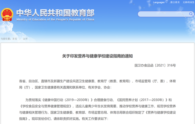 教育部網(wǎng)站今年6月24日發(fā)文《教育部聯(lián)合國(guó)家衛(wèi)生健康委等四部門印發(fā)營(yíng)養(yǎng)與健康學(xué)校建設(shè)指南》,對(duì)適應(yīng)兒童青少年生長(zhǎng)發(fā)育需要,推動(dòng)學(xué)校營(yíng)養(yǎng)與健康工作,規(guī)范學(xué)校營(yíng)養(yǎng)與健康相關(guān)管理行為作出要求。