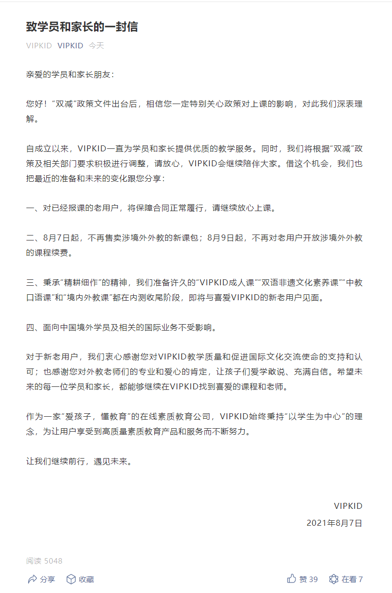 下面是VIPKID致信內(nèi)容全文: