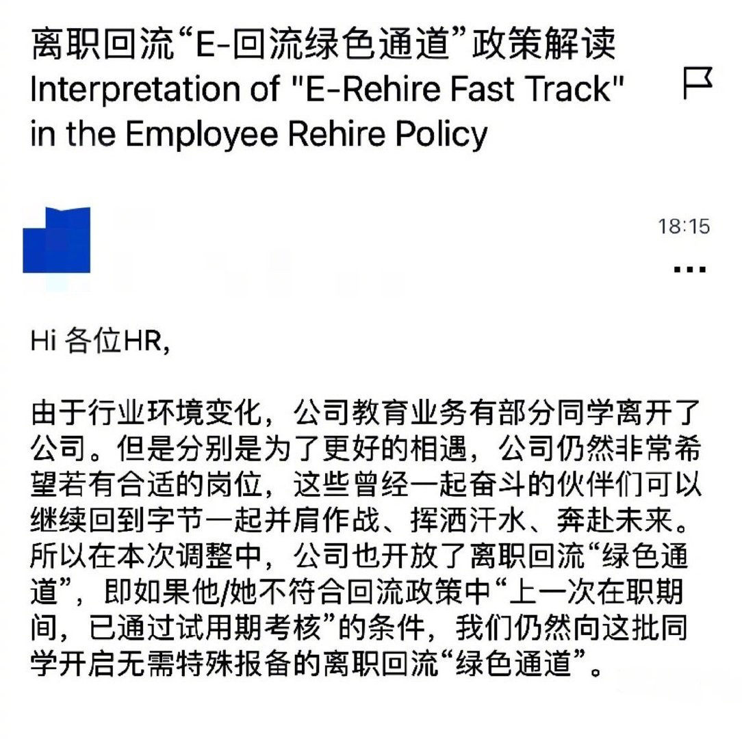 近日有字節(jié)跳動(dòng)員工在脈脈表示:收到公司發(fā)給hr的郵件,被裁的字節(jié)教育系員工都會(huì)在系統(tǒng)里保留一個(gè)回流綠色通道,可不受回流政策限制。