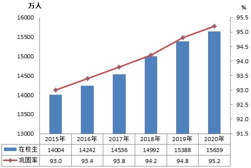 全國共有義務教育階段學校21.08萬所,招生3440.19萬人,在校生1.56億人,專任教師1029.49萬人,九年義務教育鞏固率[5] 95.2%。
