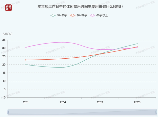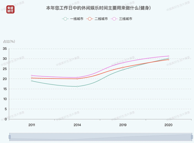 《中國(guó)美好生活大調(diào)查》發(fā)現(xiàn),健身的人群比六年前增長(zhǎng)了10%。