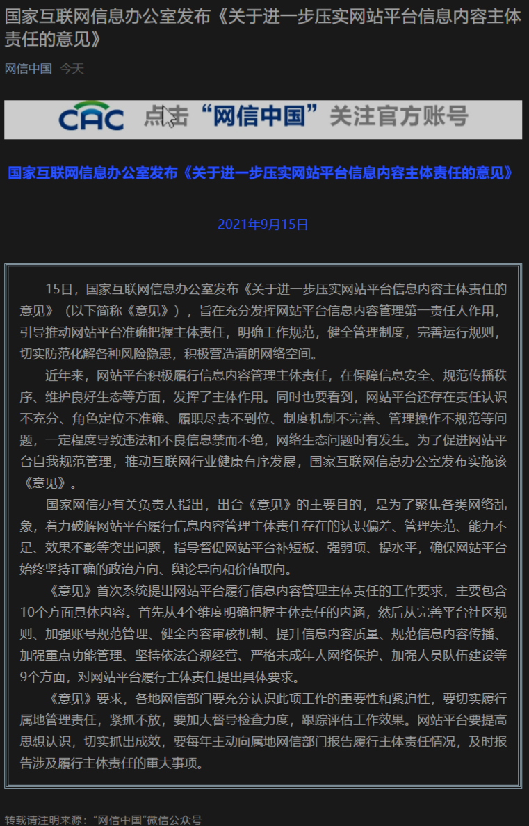 網(wǎng)信辦今日發(fā)布《關(guān)于進(jìn)一步壓實(shí)網(wǎng)站平臺(tái)信息內(nèi)容管理主體責(zé)任的意見》。