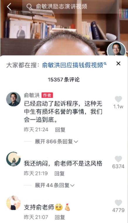 可能視頻內(nèi)容還未能完全表達(dá)完自己的意思,俞敏洪還在留言區(qū)透露:“已啟動(dòng)起訴程序,這種無中生有損壞名譽(yù)的事情,我們會(huì)一追到底。”