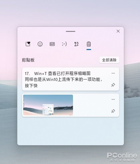 “云剪貼板”同樣也是 Win10 里的經(jīng)典模塊,在 A 機上復(fù)制好的內(nèi)容,可以在 B 機直接粘貼(需要登錄同一個微軟賬號)。Win11 在此前基礎(chǔ)上又增加了兩個細節(jié),分別是面板自由拖拽,以及國內(nèi)用戶非常喜歡的 Gif 動畫。