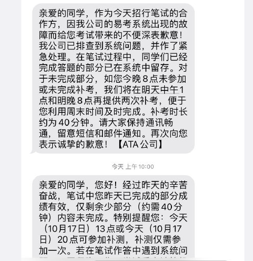 針對考試人員反映的問題,招商銀行筆試合作方、考試組織方ATA發(fā)布信息稱已排查到系統(tǒng)問題,并做了緊急處理??荚囄赐瓿刹糠謱⑦M(jìn)行補(bǔ)考,補(bǔ)考時(shí)長約為35至40分鐘。