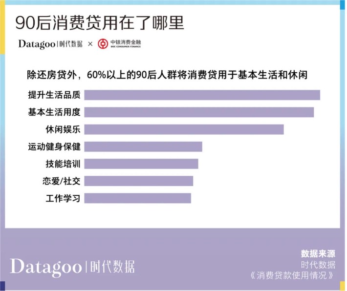 報(bào)告認(rèn)為,除了消費(fèi)方式上的差異,在最基本的生活需求滿(mǎn)足后,90后也有著與上一輩截然不同的消費(fèi)觀念。在他們看來(lái),消費(fèi)是為了更好的體驗(yàn),追求更有品質(zhì)感的生活。他們?cè)敢庠谧约合矏?ài)的領(lǐng)域投入更多的資金。而互聯(lián)網(wǎng)金融產(chǎn)品的誕生與繁榮讓年輕人的消費(fèi)少了很多約束。除還房貸外,60%以上的90后將消費(fèi)貸用于提高生活品質(zhì)和休閑。