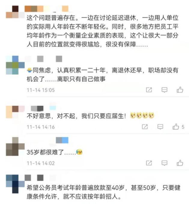 近年來,國家高度重視“35歲現(xiàn)象”,一些地區(qū)公務員招錄已經(jīng)在放寬年齡限制:比如山東事業(yè)編招考,多年來把招考年齡限制在40周歲以下。浙江今年宣布,對于2022年應屆碩士、博士研究生(非在職人員),放寬到40周歲以下。今年全國兩會,全國人大代表、編劇蔣勝男建議,取消國家公務員報考35歲以下的年齡限制。