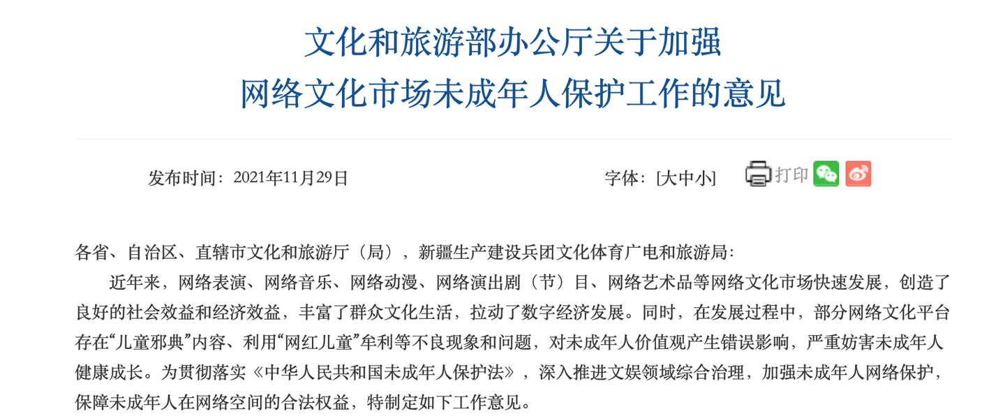 文化和旅游部辦公廳關(guān)于加強(qiáng)網(wǎng)絡(luò)文化市場(chǎng)未成年人保護(hù)工作的意見(jiàn)