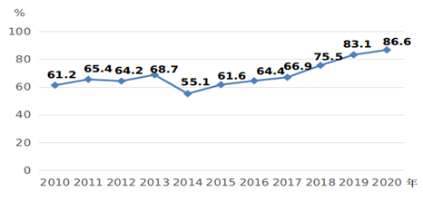 圖8 2010—2020年全國(guó)農(nóng)村集中式供水受益人口比重