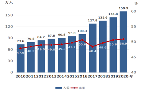 4.各類高等教育中女生占比均超過男生?!毒V要》實(shí)施以來,我國(guó)高等教育得到快速發(fā)展,女性接受高等教育機(jī)會(huì)不斷增加;多渠道、多形式為貧困和殘疾女大學(xué)生提供資助,女性平等接受高等教育得到有力保障。2020年,高等教育毛入學(xué)率為54.4%,比2010年提高27.9個(gè)百分點(diǎn)。高等教育在校生中女研究生人數(shù)為159.9萬人,占全部研究生的比重達(dá)到50.9%,比2010年提高3.1個(gè)百分點(diǎn)(見圖4);普通本???、成人本專科在校生中女生分別為1674.2萬人和450.6萬人,占比分別為51.0%和58.0%,分別比2010年提高0.1個(gè)和4.9個(gè)百分點(diǎn)。